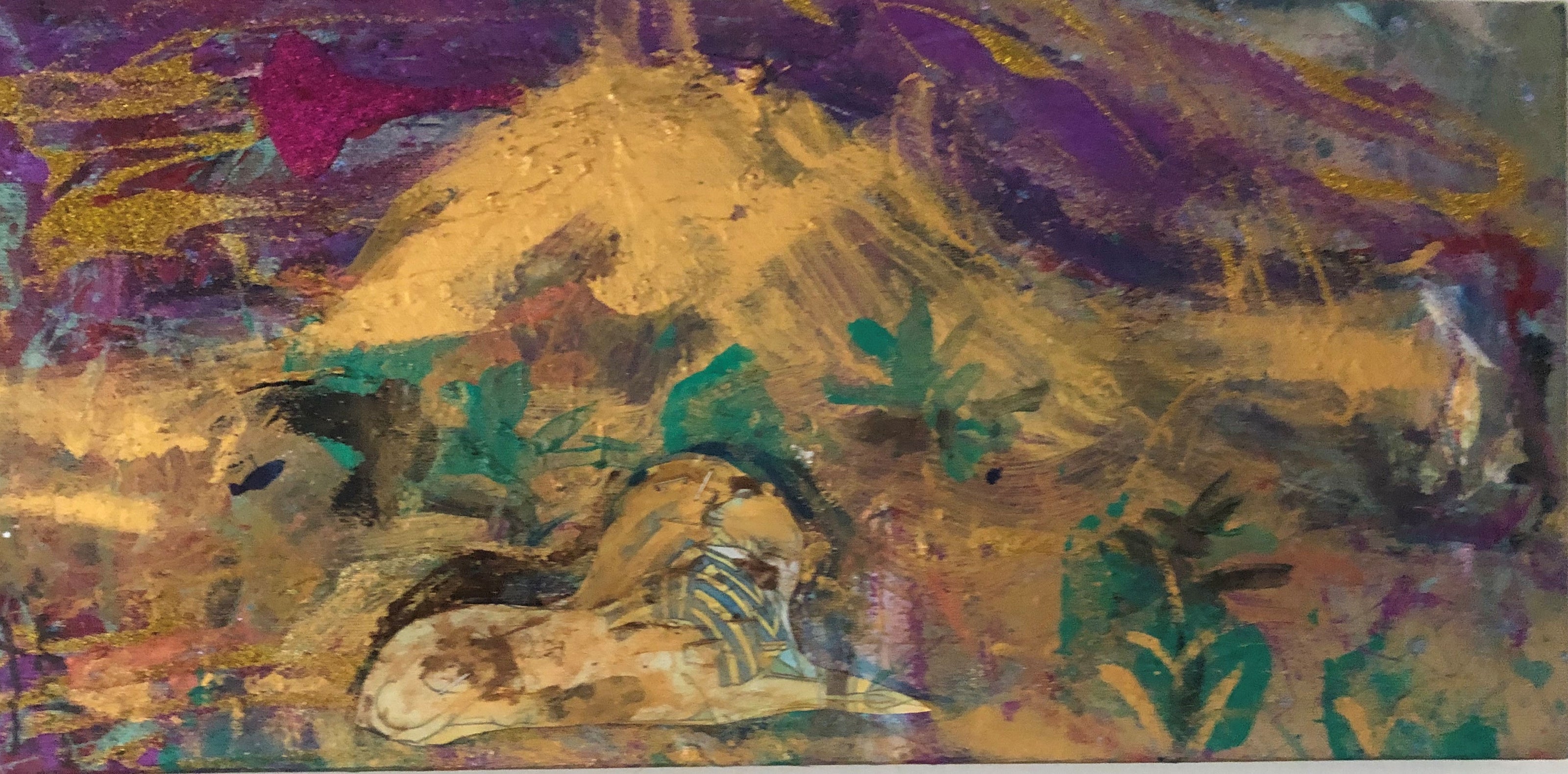 In this ancient Egyptian desert landscape, I painted a huge male lion, taking a nap or waiting for his next meal. The lion is peacefully resting underneath the shade of a tall palm tree.