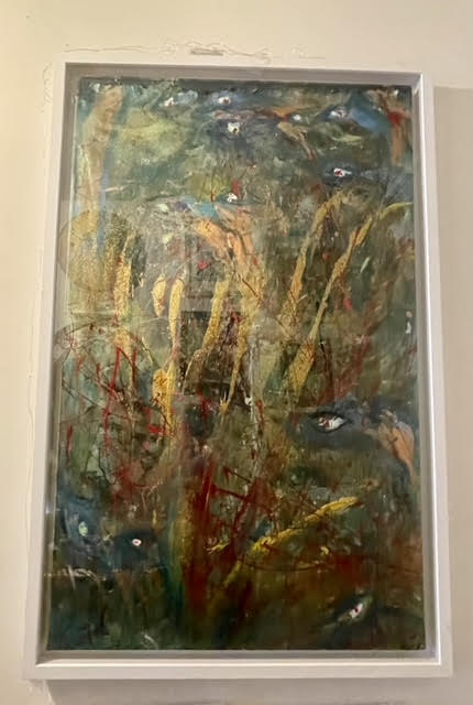This painting is highly texturized in a technique I use five putting on heavy paint and then scratching it off with a knife or fork and then glazing again I will do this several times.