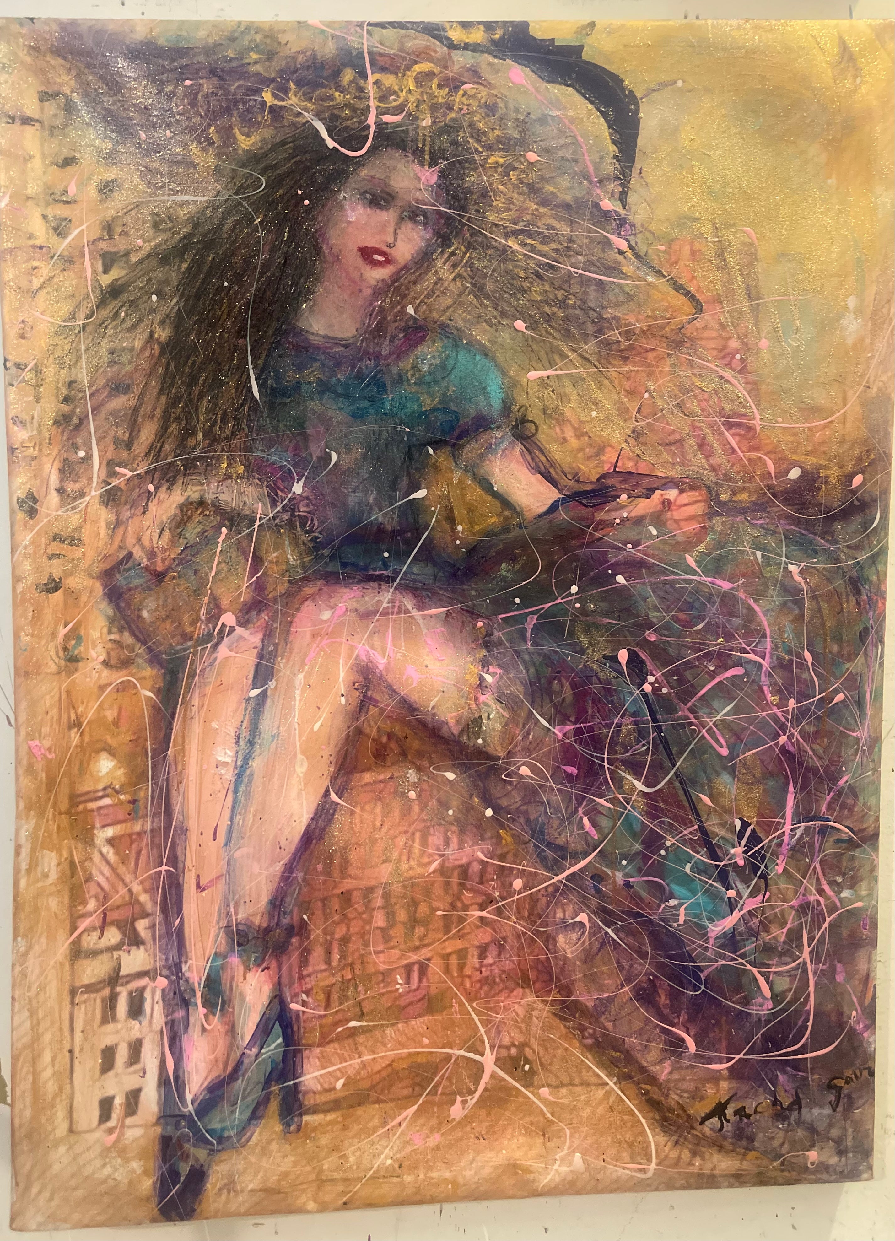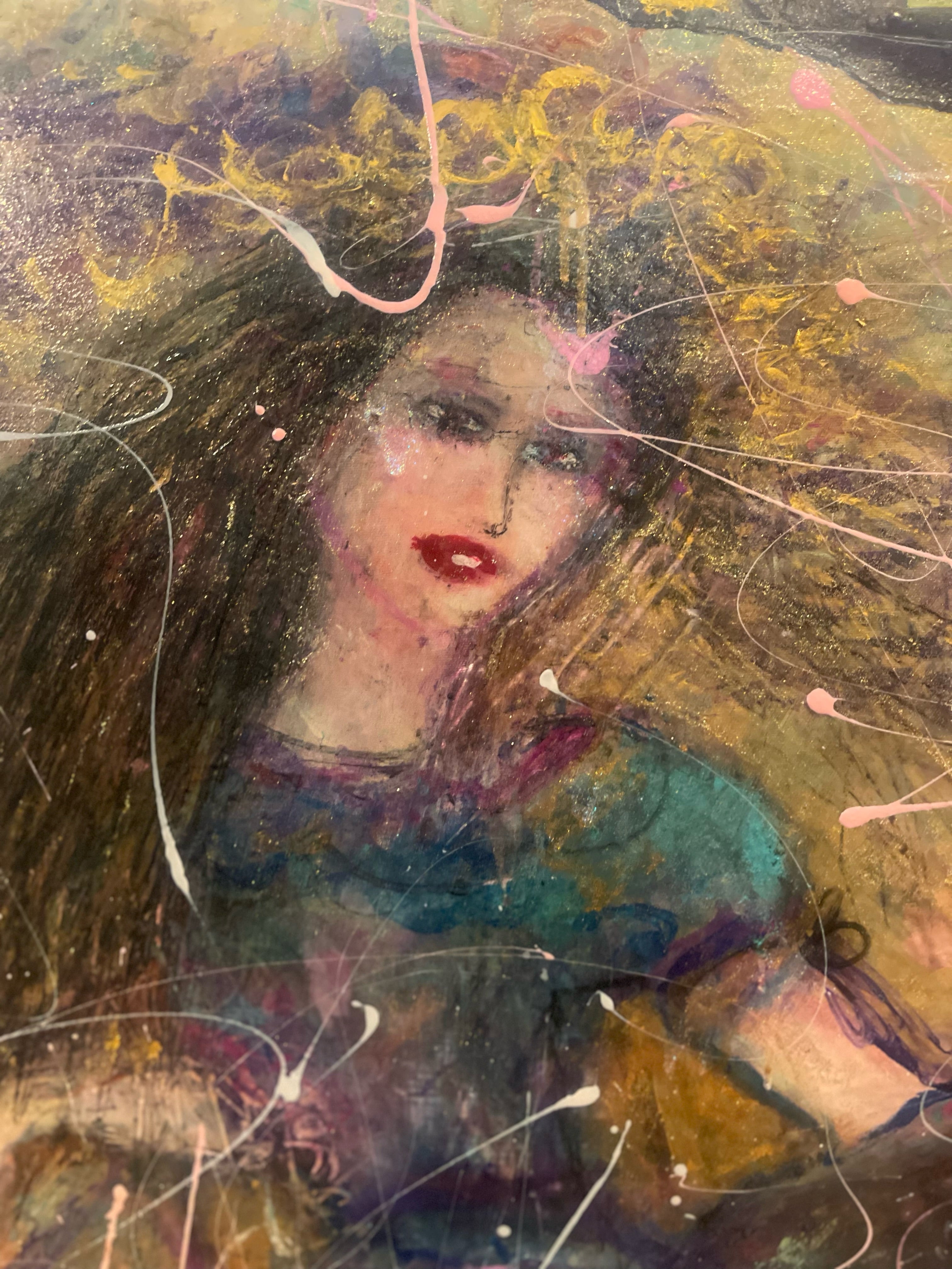 My painting took me over four months to complete working with my sketches, vivid intensity-colors, and high gloss gels, to create transparency and elegance to seduce the viewers desire to know more .