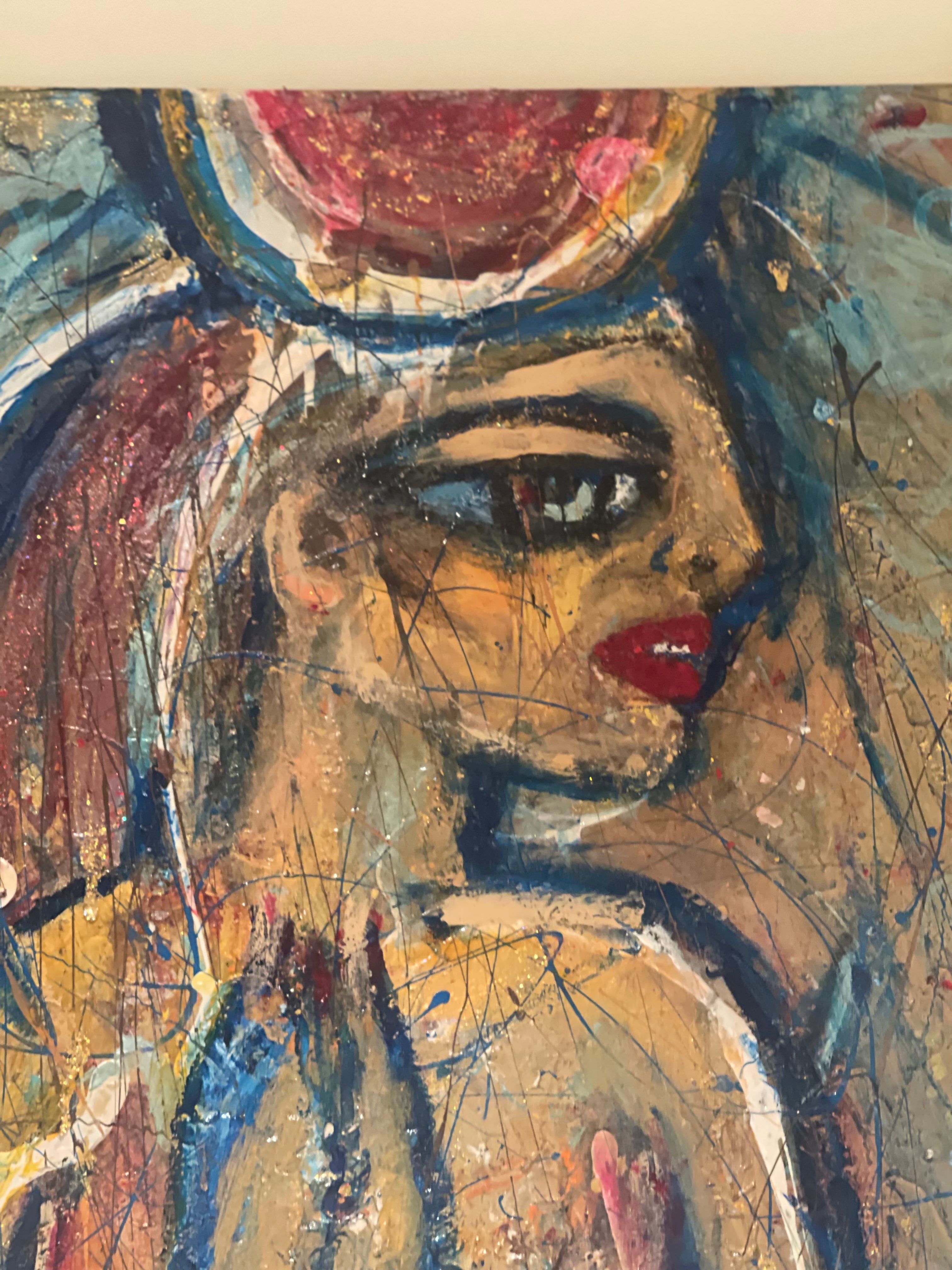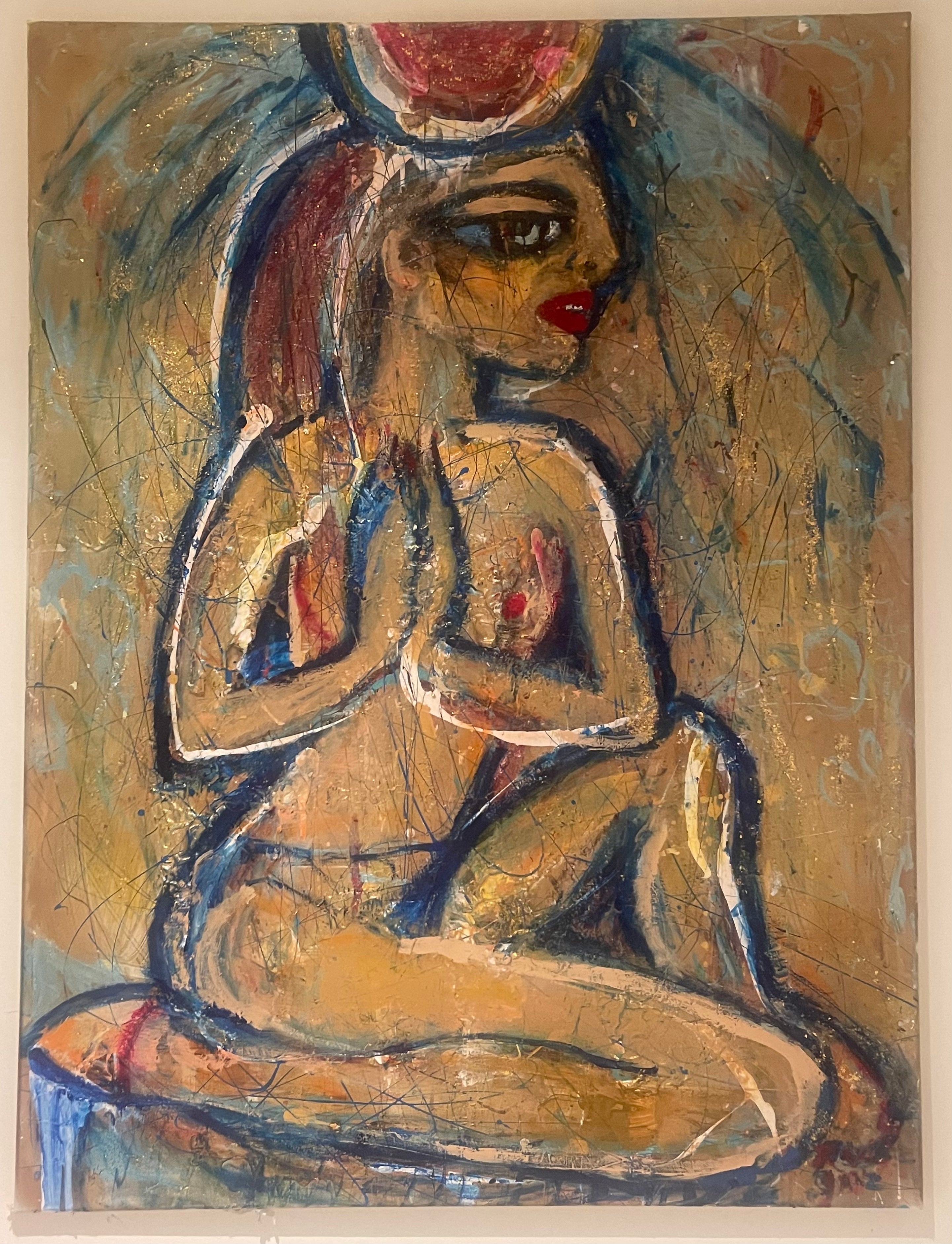 I wanted to pay tribute to the ancient Egyptian‘s dedication of worship to their gods, using a lot of gold paint and defining the figure with dark blue lines . A very sensual face seem to emerge from my canvas.