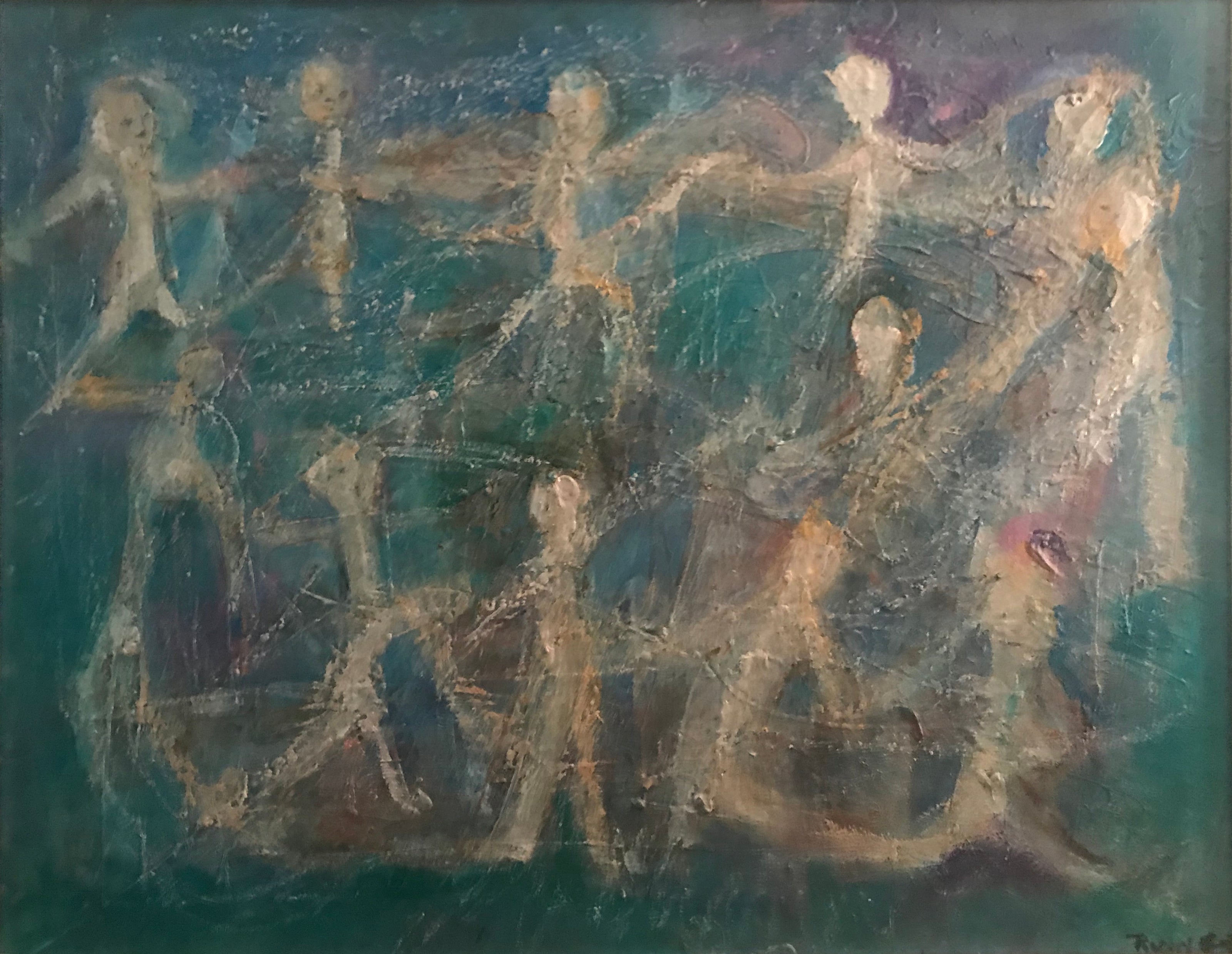 “Chagall like colors” of deep blue turquoise and green are balanced with white and touches of gold paint.