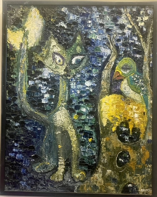 This is actually the first oil painting I did at the age of eight. My parents bought me a set of oil paints and I was inspired by our Siamese cat, Sheik who used to go out in our backyard and stare at birds in the tree, hoping that one might fall down and be his dinner.