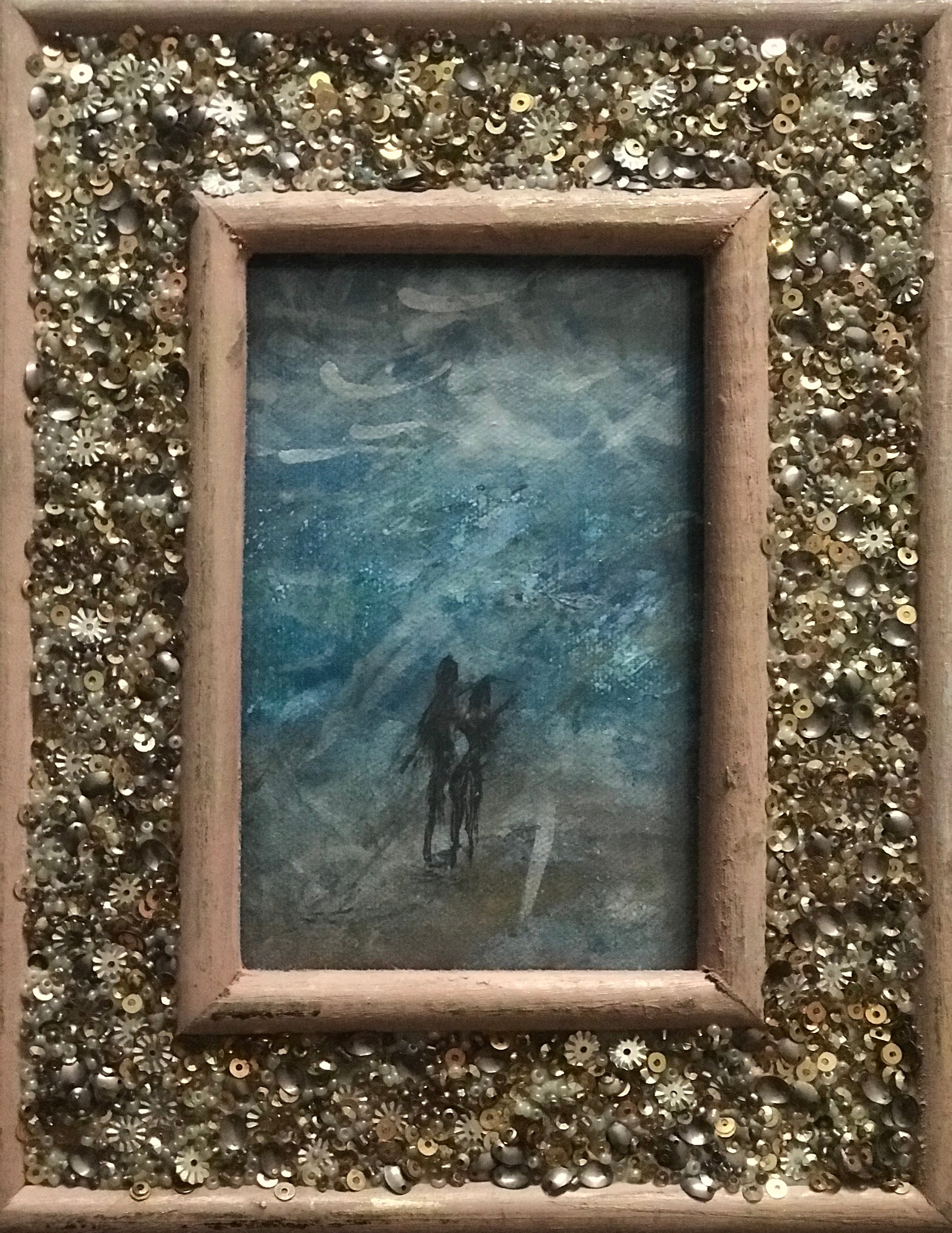 This is a very tiny powerful painting of two soulmates who have found each other. These beautiful silhouettes of a man and a woman could be any age, ethnicity, any city, any country anywhere.